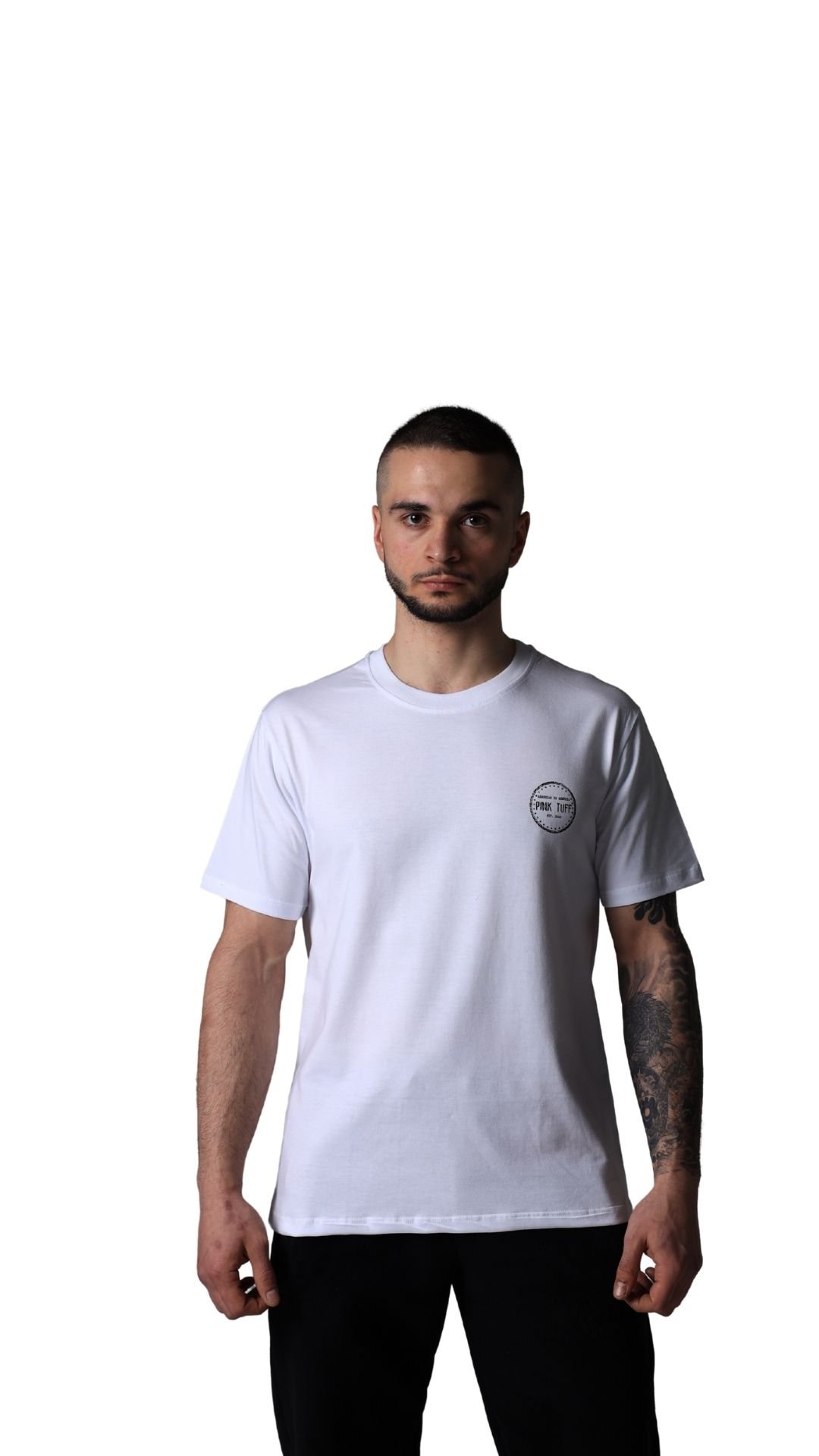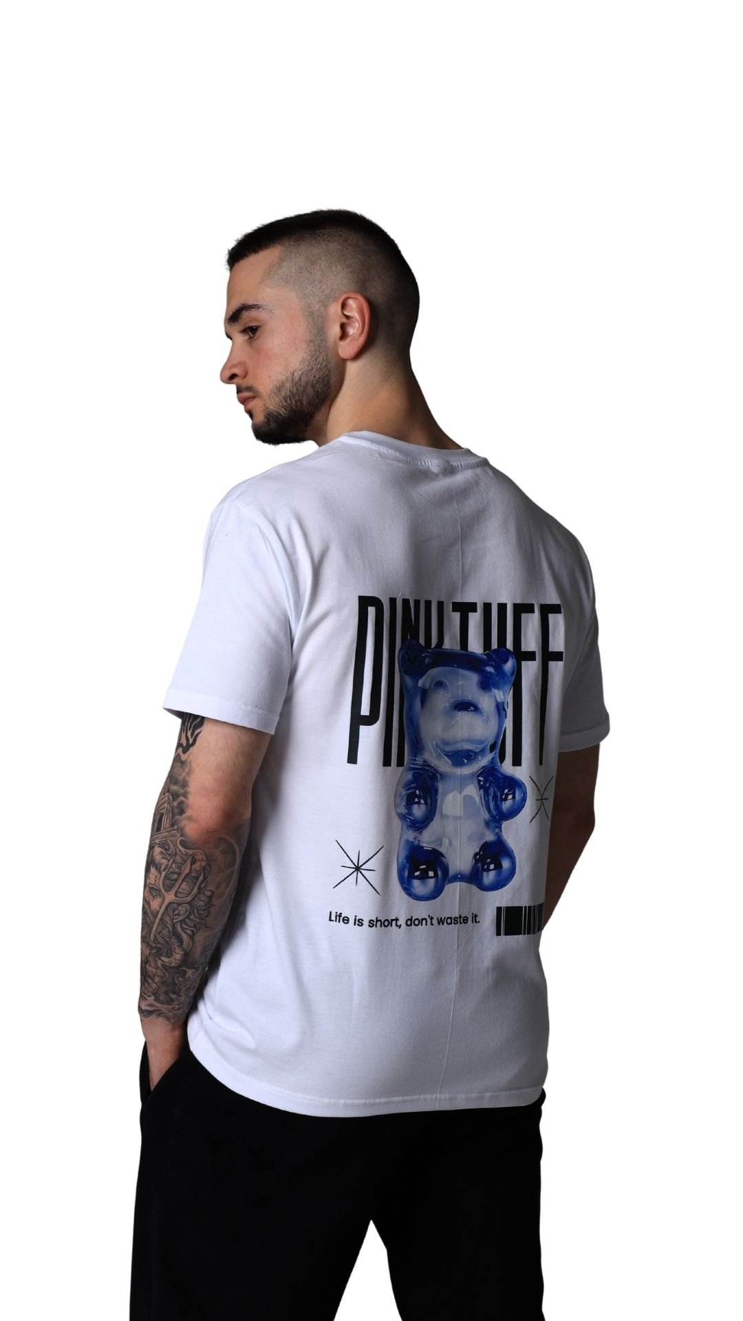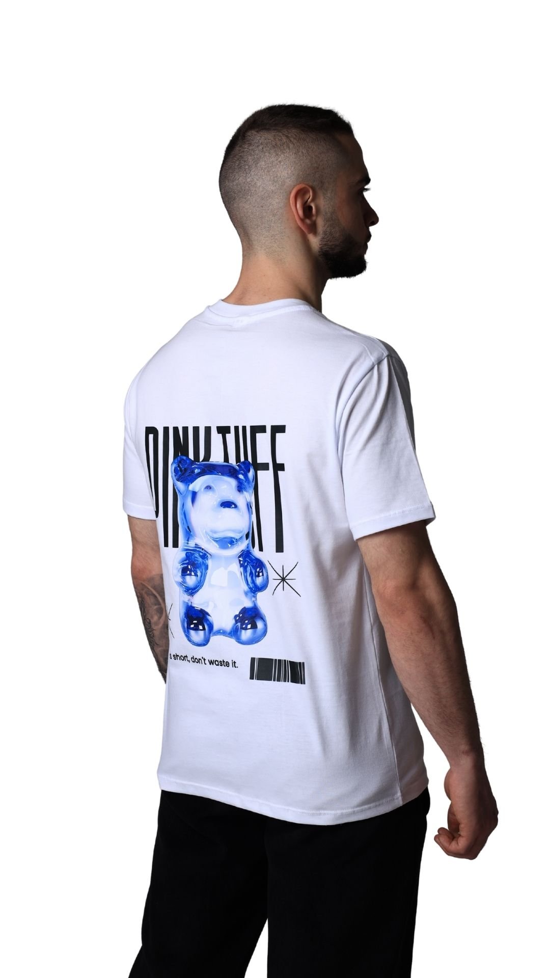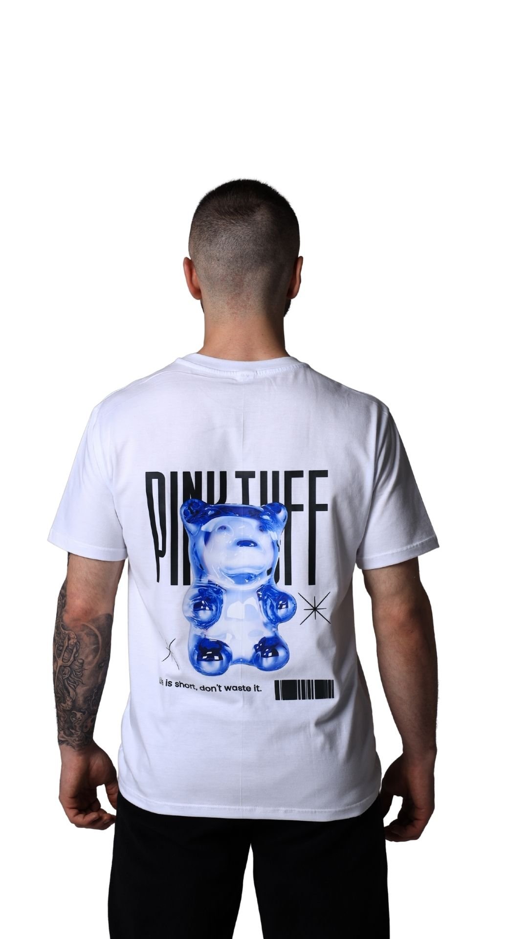 This white T-shirt features a glossy blue bear illustration on the back, layered with PinkTuff typography and minimal design elements. The contrast between the playful figure and clean layout gives the piece a modern streetwear feel. Designed with a relaxed, unisex fit, it’s easy to wear on its own or styled as part of a layered look.