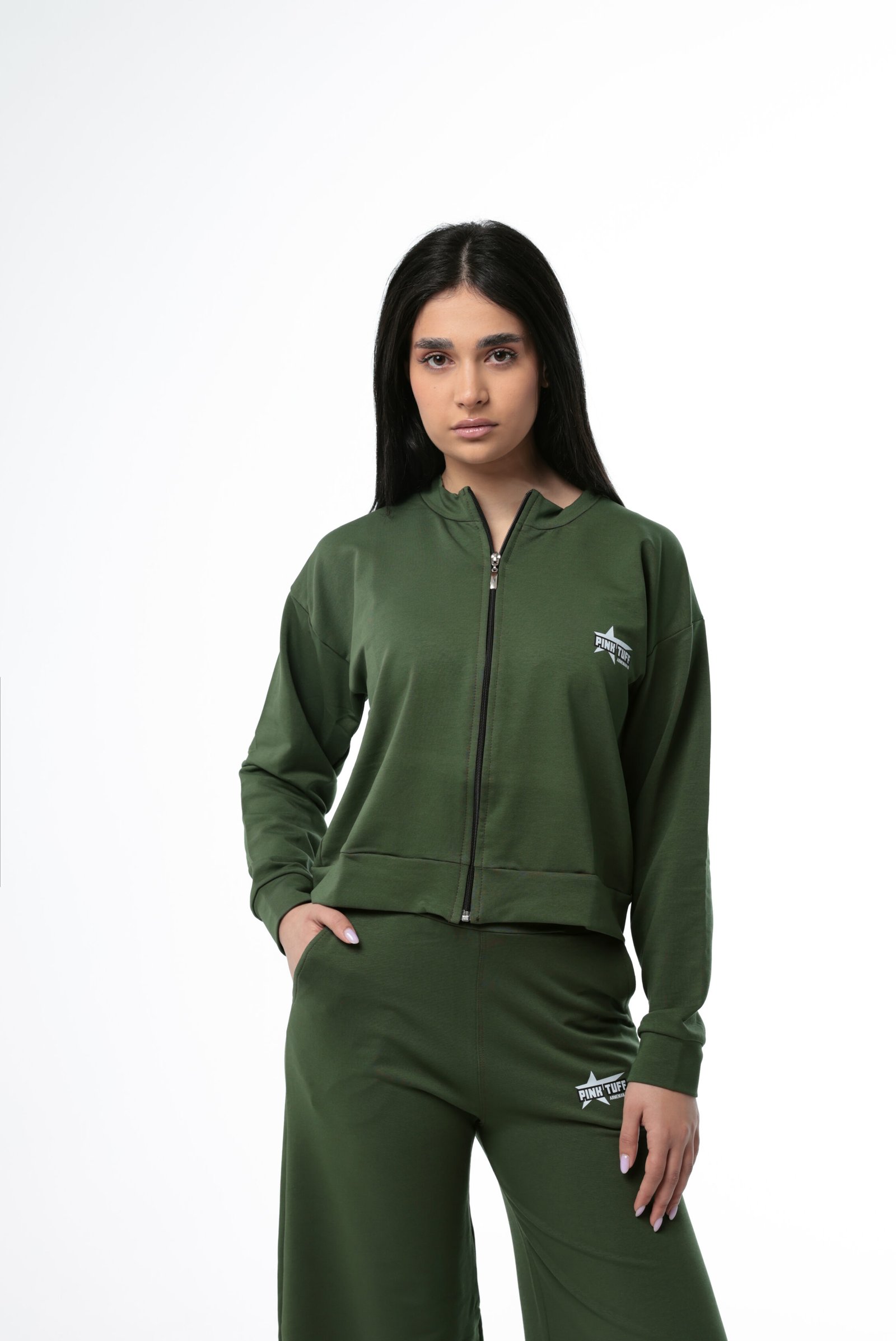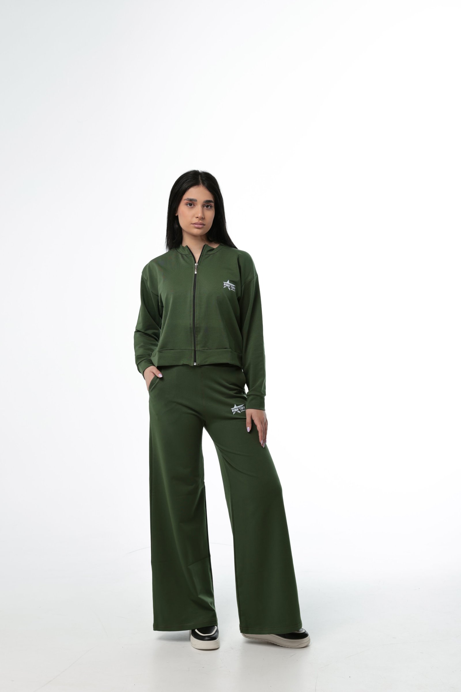 This olive green two-piece set combines a structured zip-up top with relaxed wide-leg pants for a sleek, balanced silhouette. The back design features bold PinkTuff typography layered with artistic elements, creating a strong visual statement while maintaining a clean, elevated look. The front stays minimal with subtle branding for a modern finish.